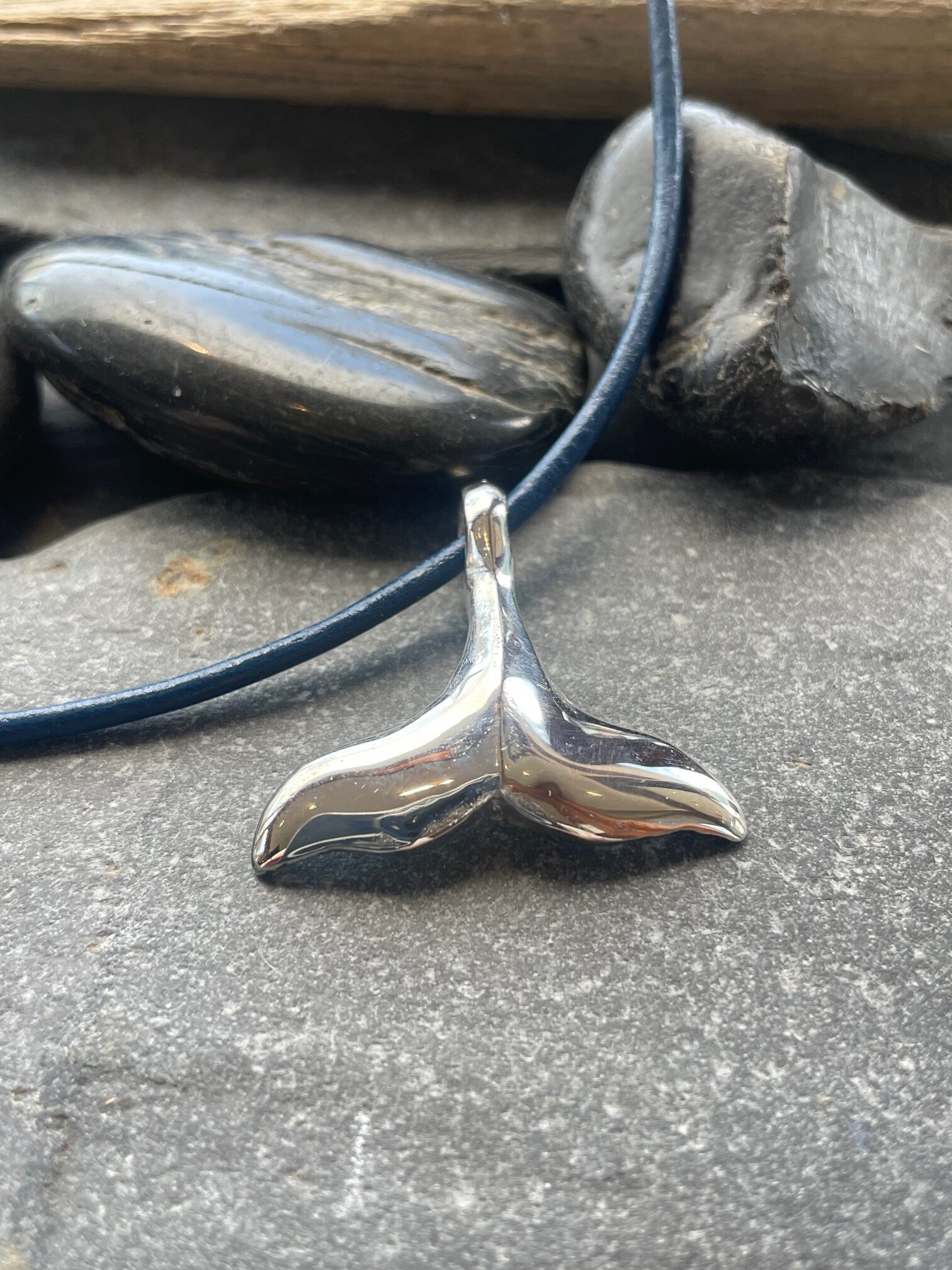 This beautifully heavy whale tail pendant is very popular. Hand carved from wax and cast in Solid Sterling silver.